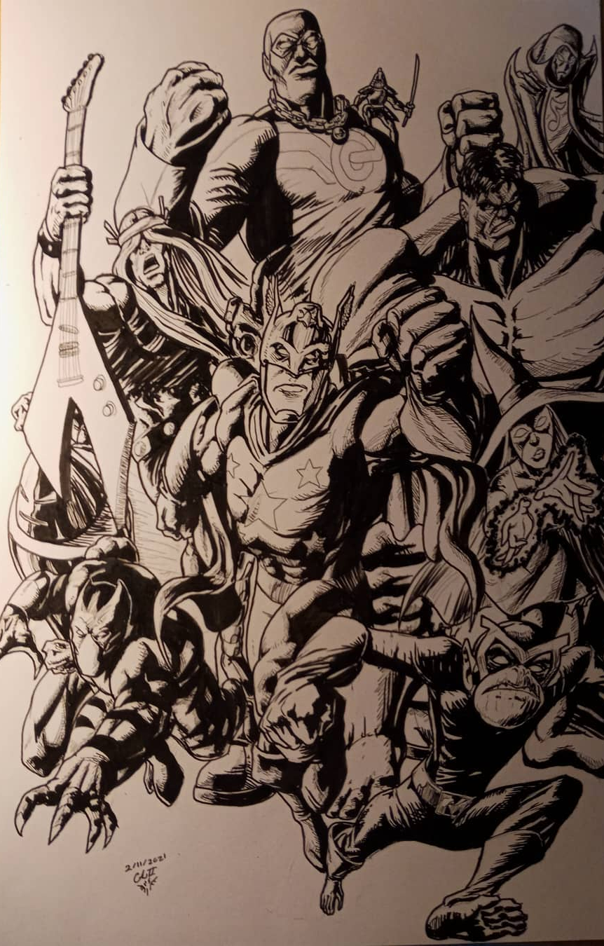 Inking can be done in many ways but my preferred method is a dip pen, but if pressed for time I will use fine liner pens. For larger areas I use a paint brush and india ink, its fast and efficient. I use white acryllic ink for corrections or starscapes and effects. And soooo much crosshatching. Not that I'm complaining, I love the depth of detail that it gives the piece, and it seems to go over well with clients.